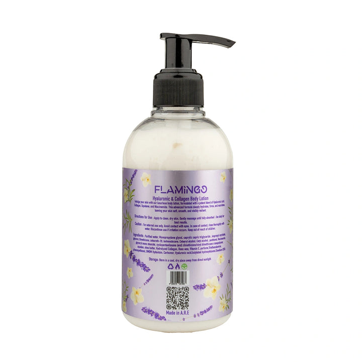 استمتع بتجربة تهدئة وترطيب مع لوشن الجسم فلامنغو باللافندر والفانيليا . هذا اللوشن الفاخر غني بمزيج من حمض الهيالورونيك والنياسيناميد والسكوالين والكولاجين ، ليعمل معًا على ترطيب البشرة بعمق، وتحسين مرونتها، ومنحها إشراقة ناعمة ومشرقة.
